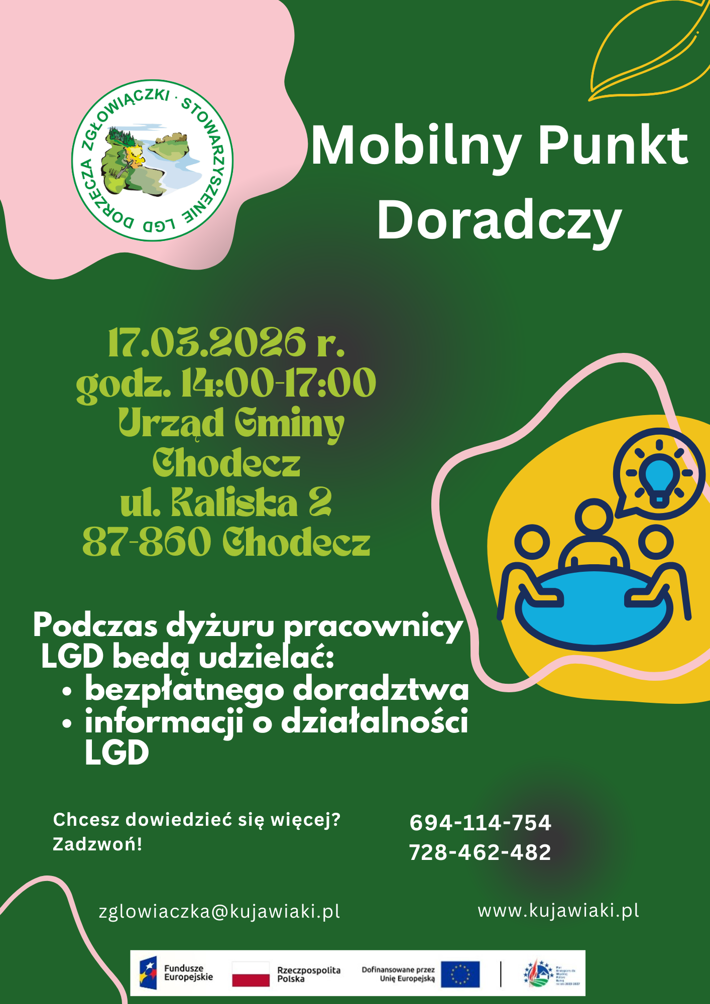 Miejsce pracy: Siedziba Stowarzyszenia Lokalnej Grupy Działania Dorzecza Zgłowiączki w Choceniu ul. Sikorskiego 12 oraz obszar LSR (powiat włocławski).