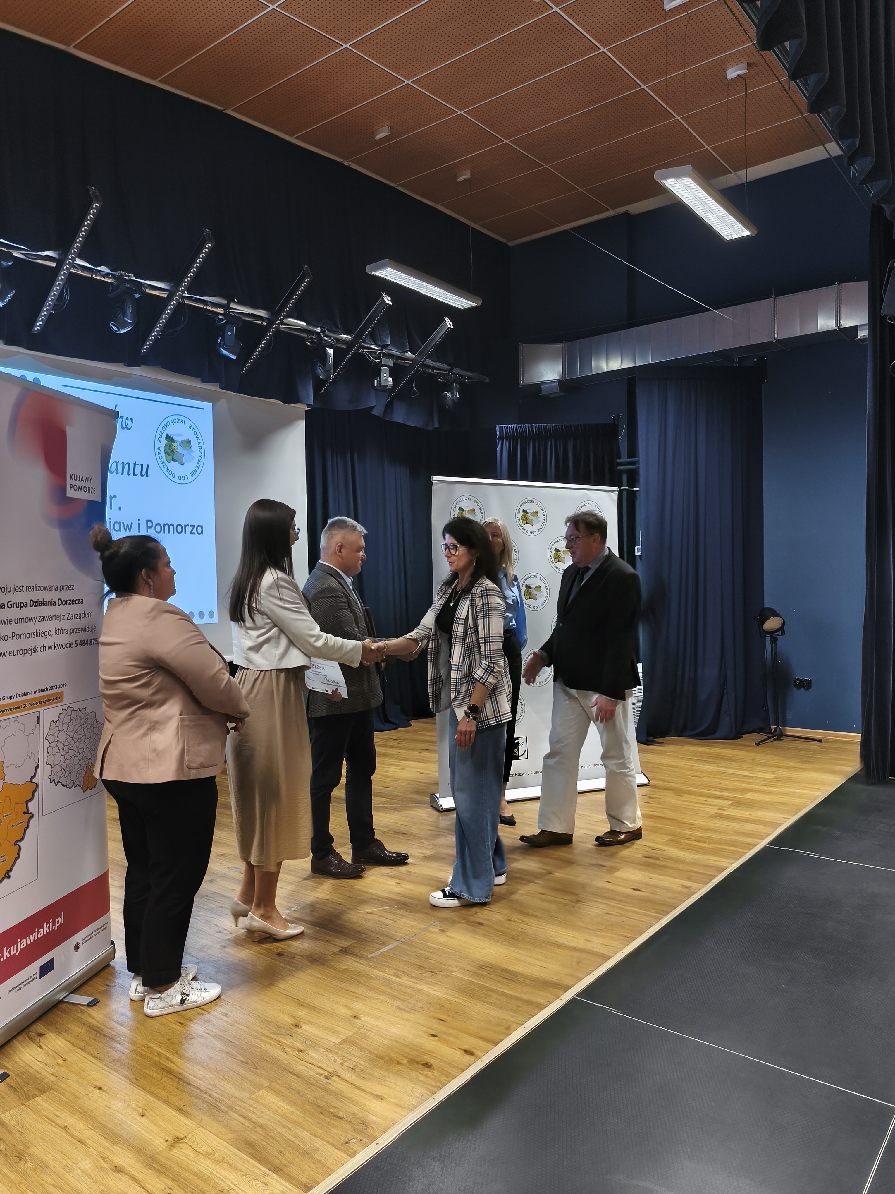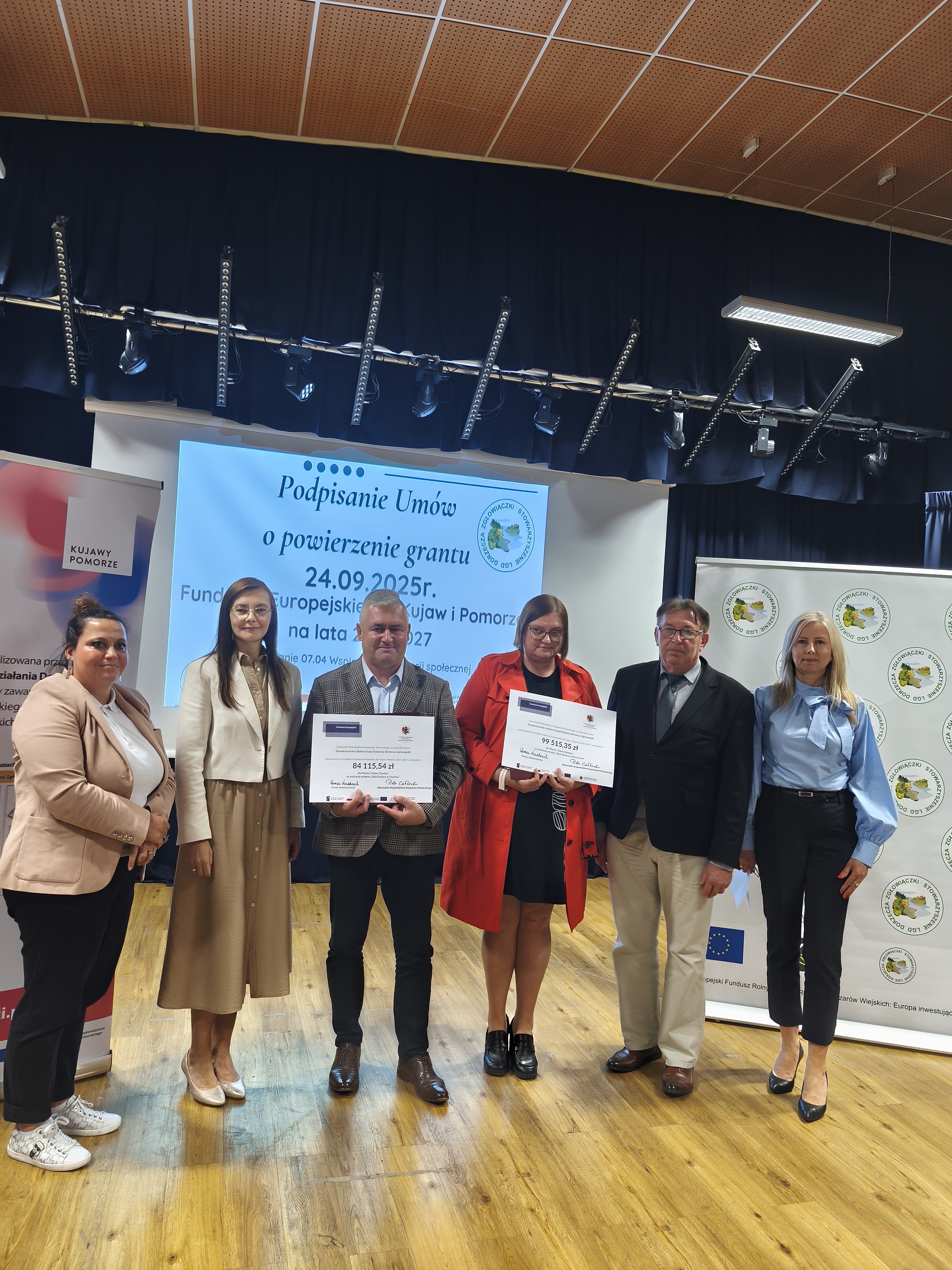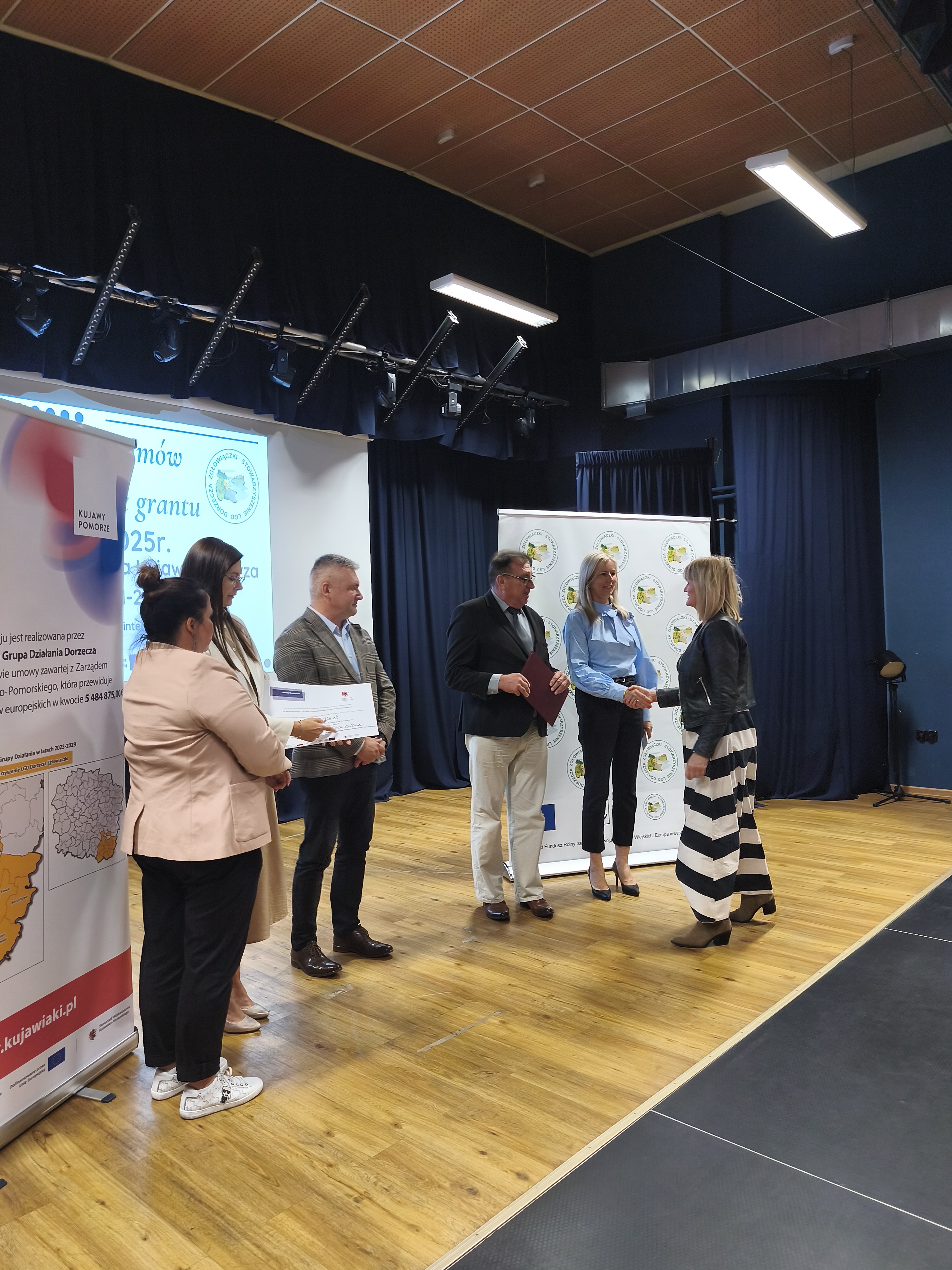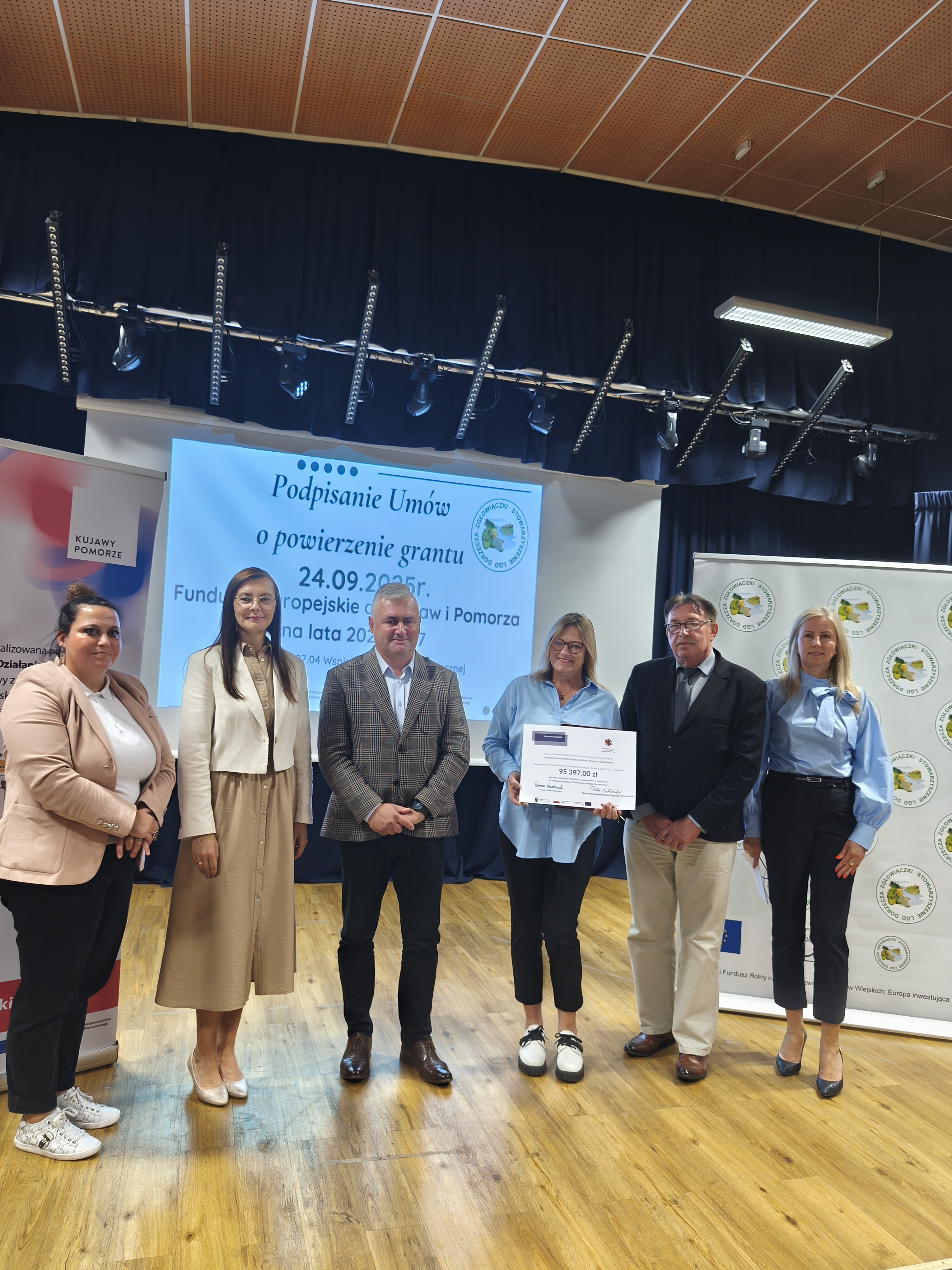 Umowy oraz pamiątkowe czeki wręczyli: Roman Nowakowski prezes Zarządu LGD, Hanna Piastowska –wiceprezes Zarządu LGD, Jarosław Grabczyński –wiceprezes Zarządu LGD, Pani Agnieszka Tuczyńska, zastępca Dyrektora Departamentu Rozwoju Obszarów Wiejskich Urzędu Marszałkowskiego Województwa Kujawsko-Pomorskiego w Toruniu, Aneta Hoffman –dyrektor biura LGD.