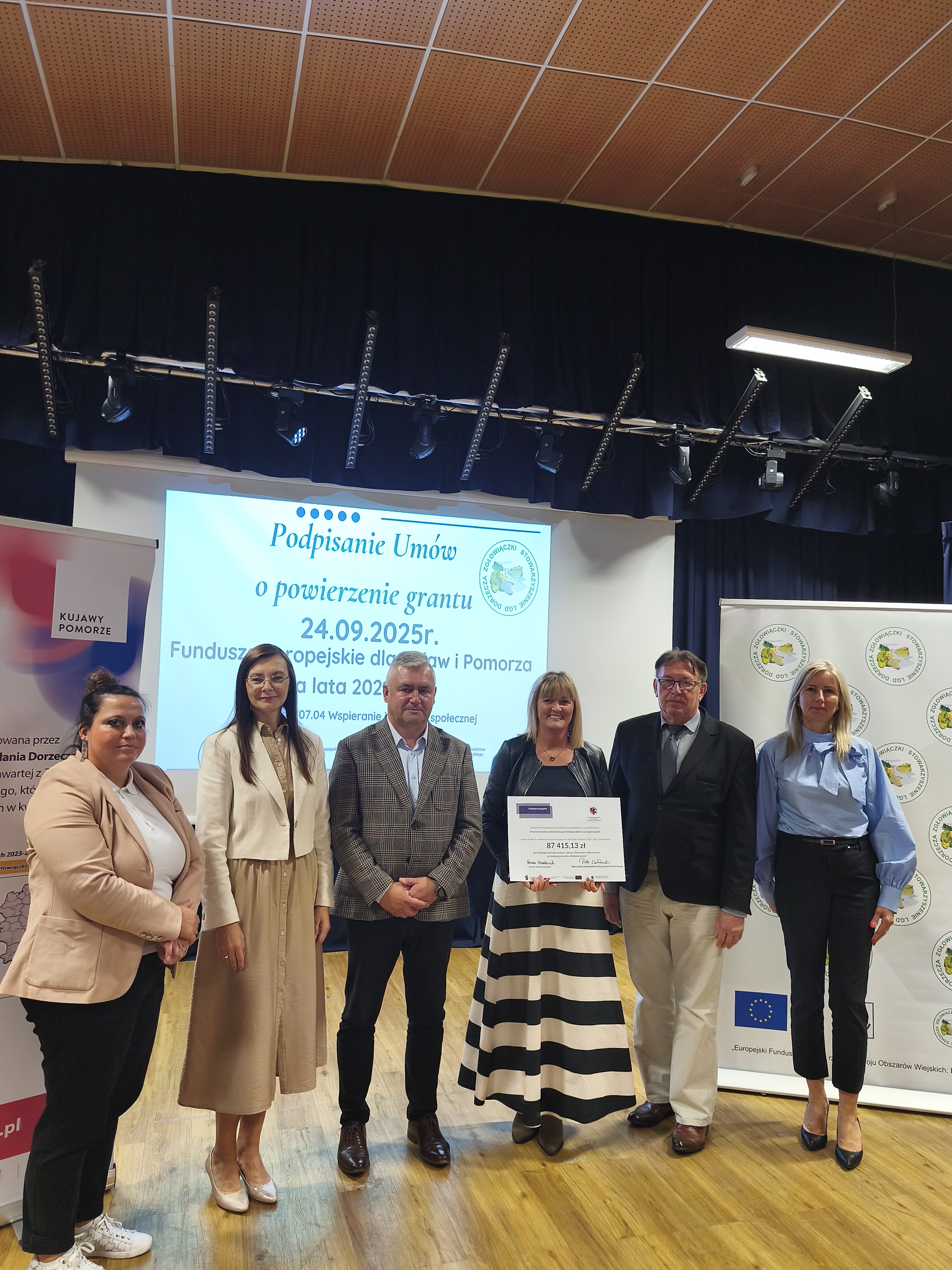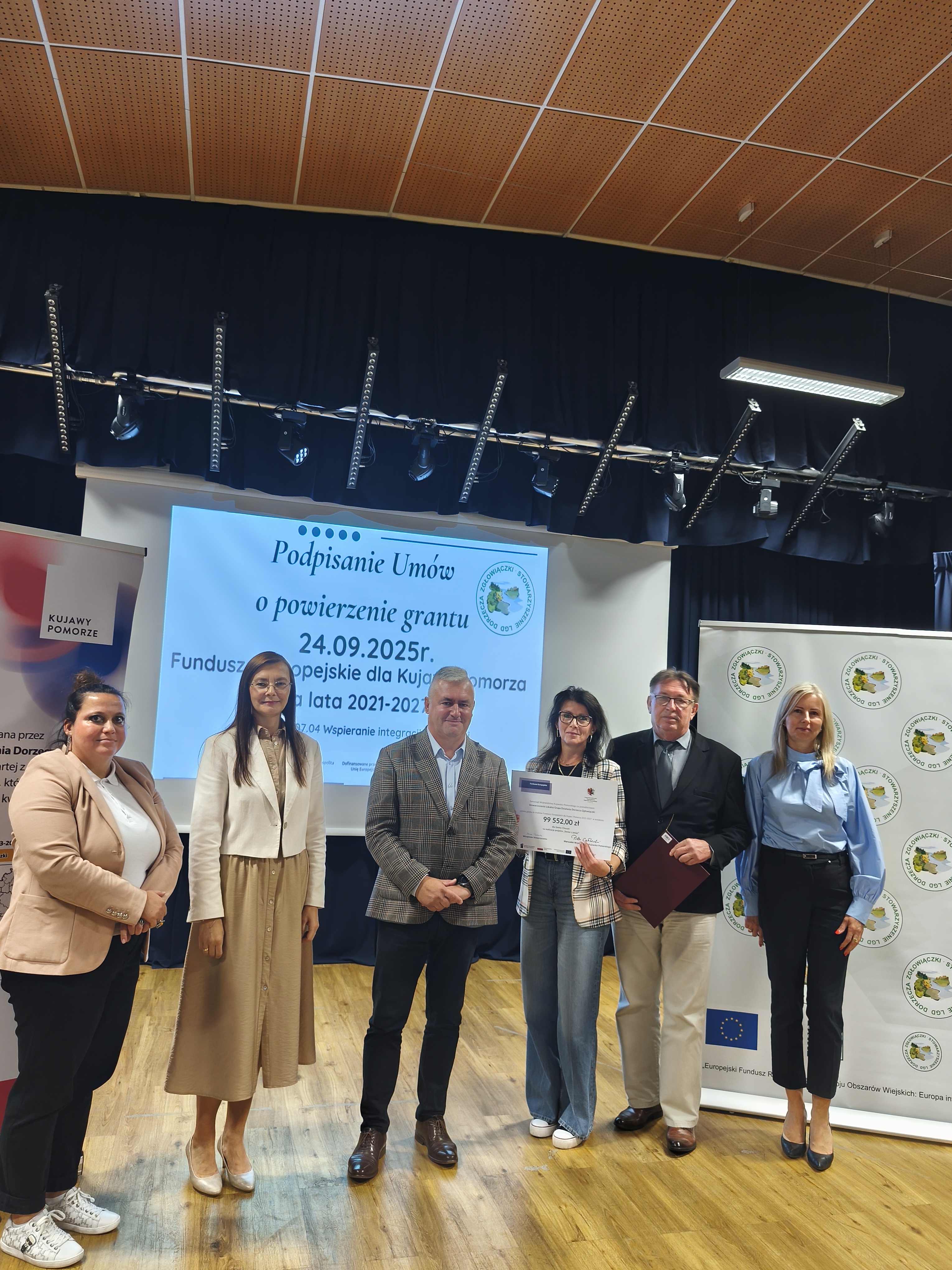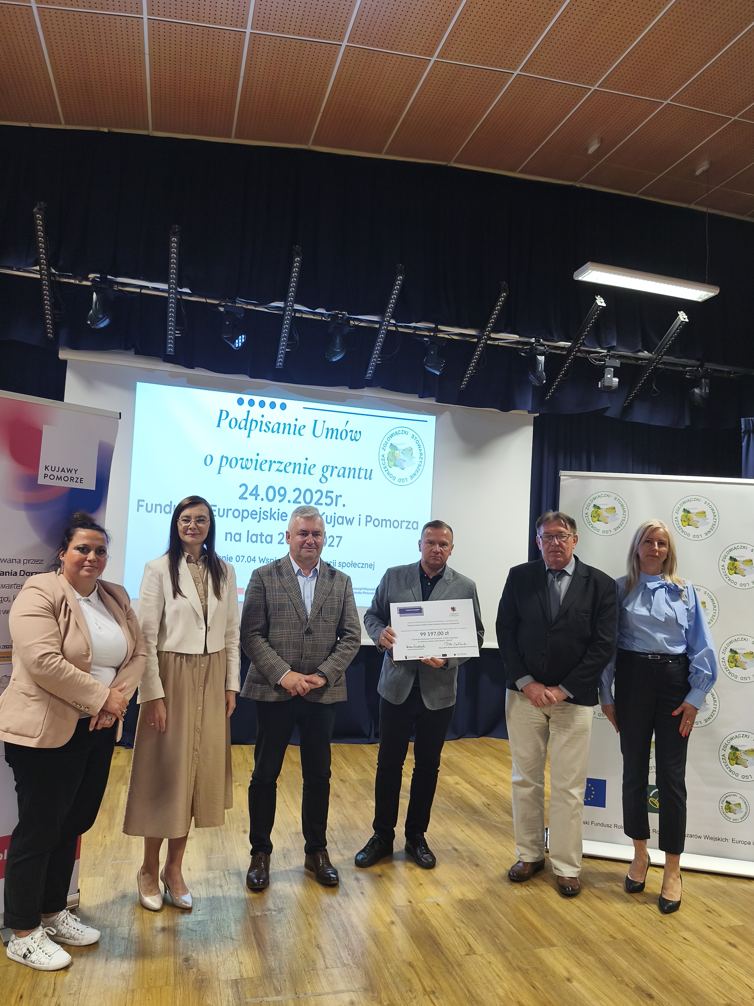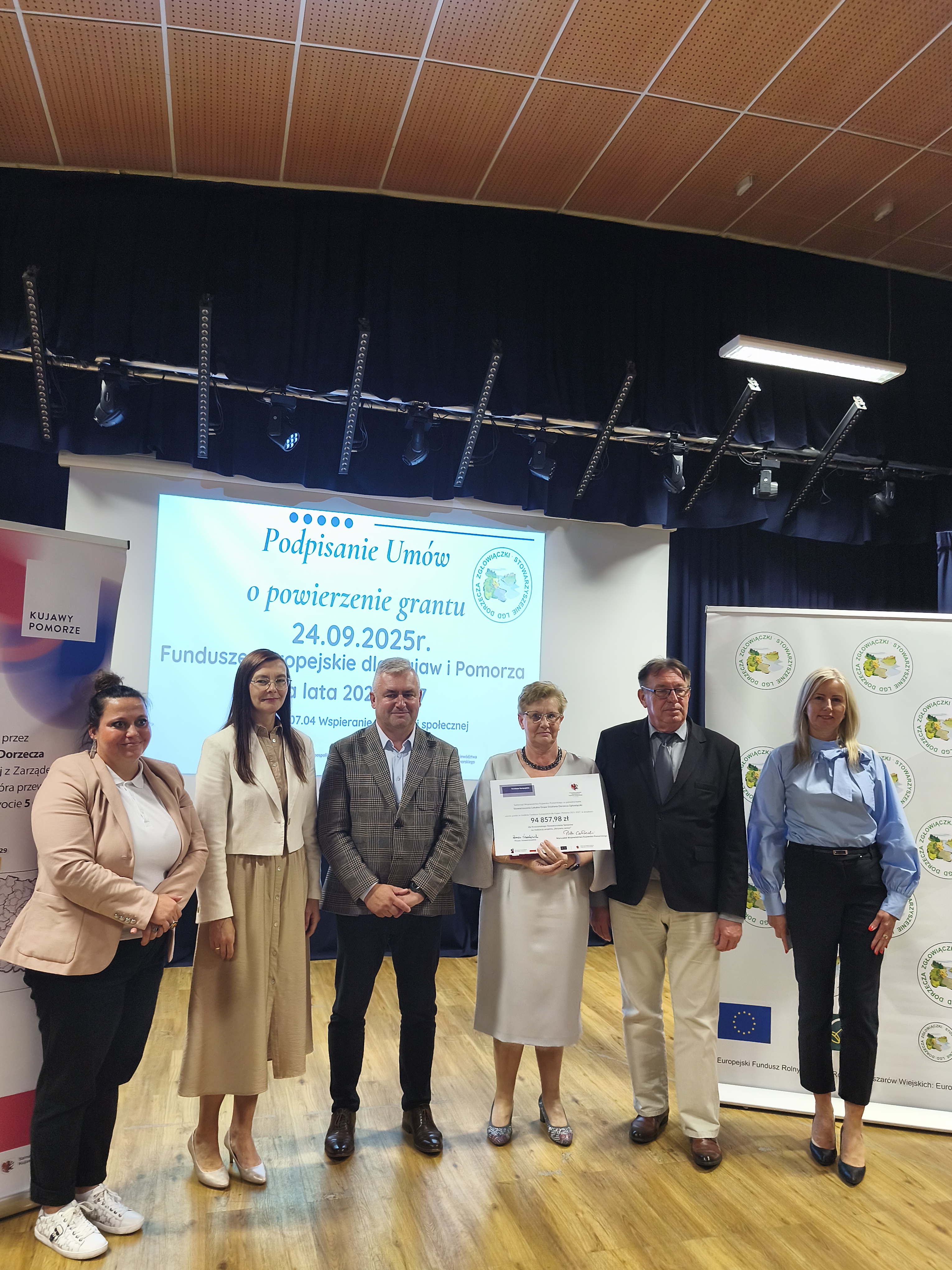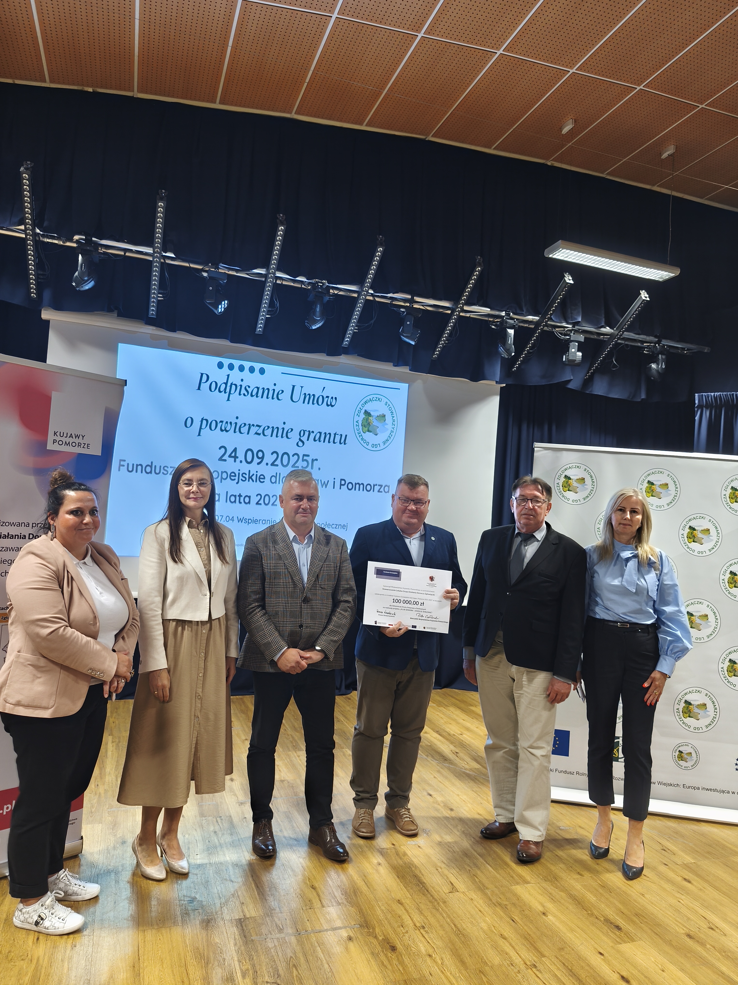 Umowy oraz pamiątkowe czeki wręczyli: Roman Nowakowski prezes Zarządu LGD, Hanna Piastowska –wiceprezes Zarządu LGD, Jarosław Grabczyński –wiceprezes Zarządu LGD, Pani Agnieszka Tuczyńska, zastępca Dyrektora Departamentu Rozwoju Obszarów Wiejskich Urzędu Marszałkowskiego Województwa Kujawsko-Pomorskiego w Toruniu, Aneta Hoffman –dyrektor biura LGD.
